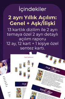 💝 Yıllık Aşk ve İlişki Açılımı: Yine 13 kartlık bir dizilim ile 2026 yılında aşkta karşılaşacağın sınavları öngörmeyi ve bilinçli bir şekilde karşılamayı öğreneceksin! Duygusal ihtiyaçlarınla uyumlu seçim ve kararları şekillendirmek için ideal bir tarot deneyimi!